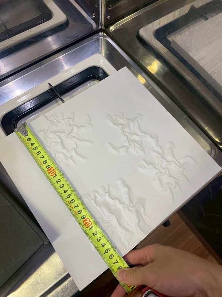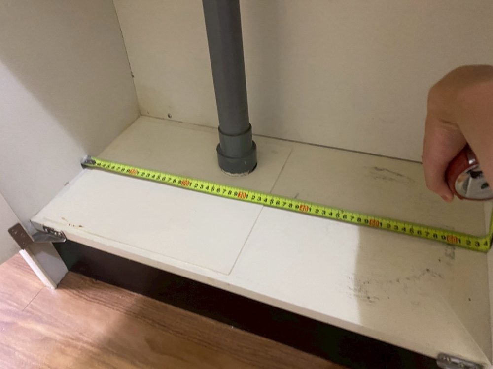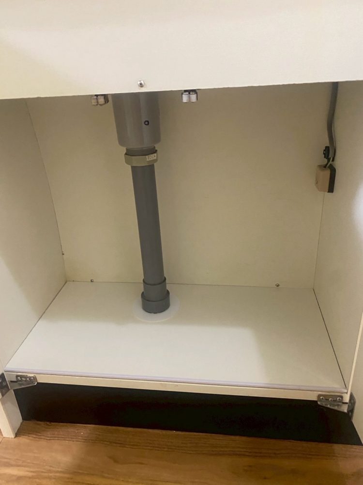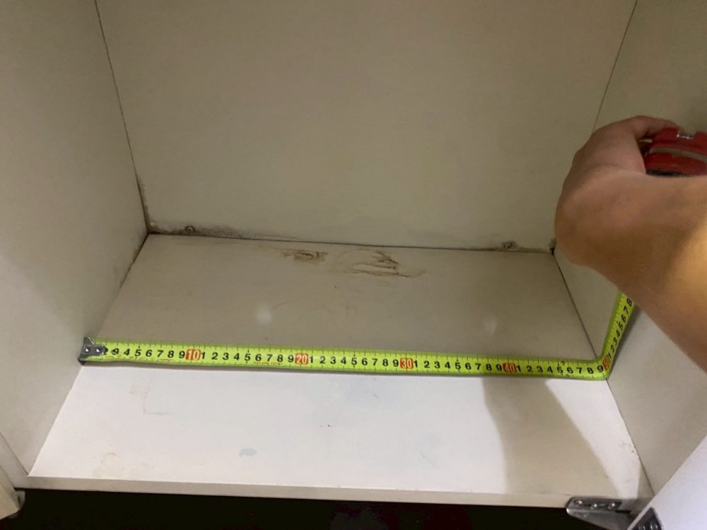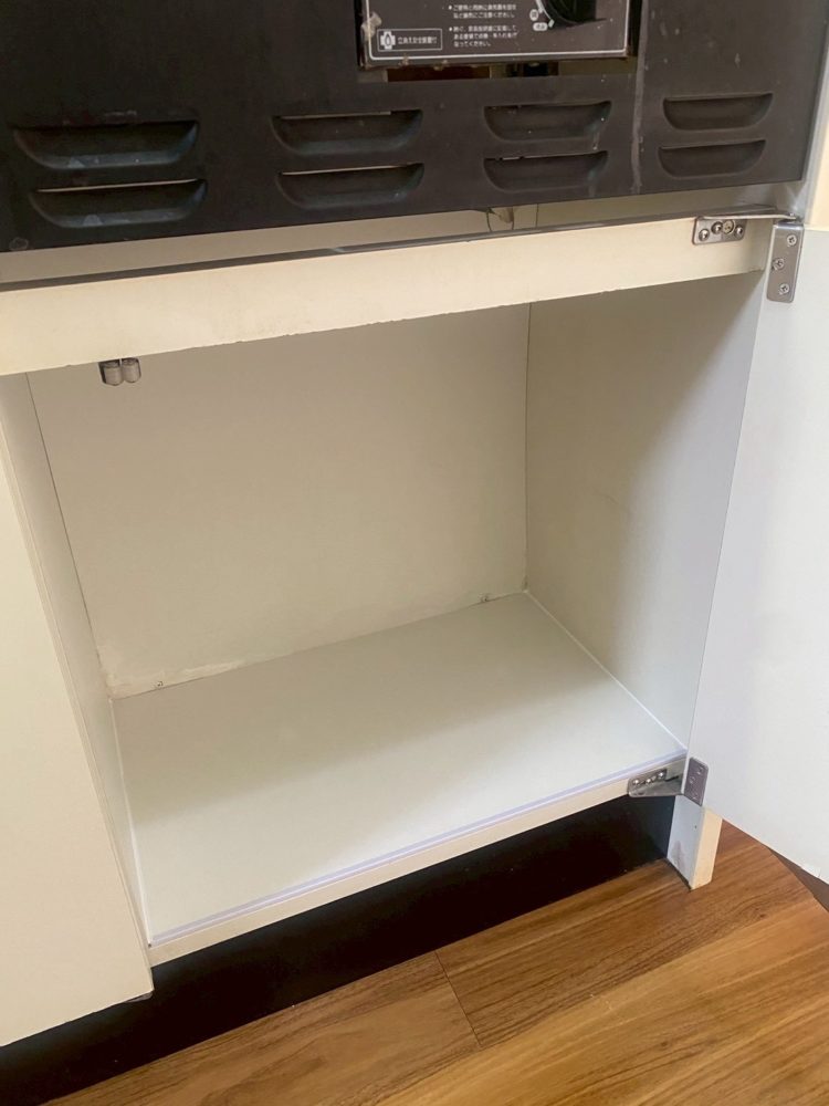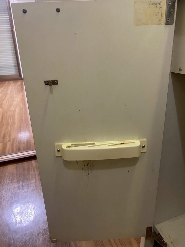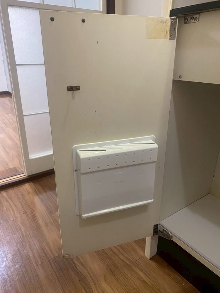 キッチン棚は湿気がたまってしまうと、曲がってしまったりカビが生えてしまったりしてしまうケースがございます。上記写真はカビ+使用痕が残っておりました。また包丁刺しもだいぶ年季を感じます。